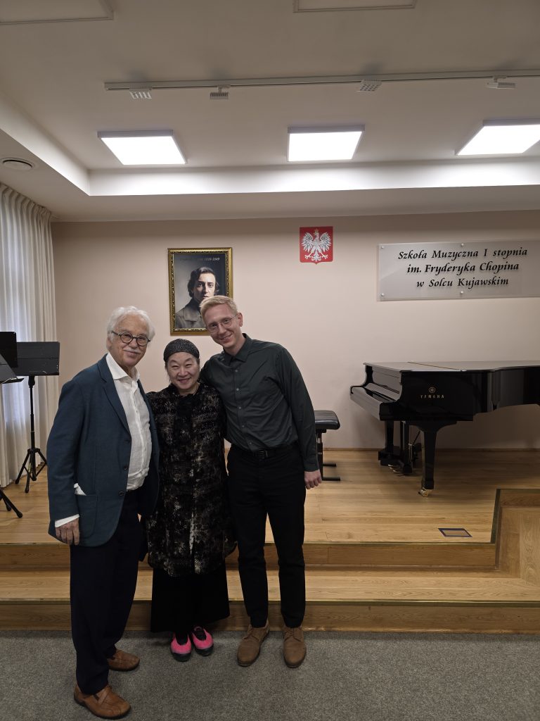 W piątek 24.10.2025 Naszą Szkołę odwiedził prof. Edward Auer wraz z małżonką prof. Junghwa Moon Auer. Edward Auer jest legendarnym pianistą, pierwszym amerykańskim finalistą konkursu chopinowskiego (5. Nagroda w 1965), w którego jury zasiadał dwukrotnie, ale też Konkursu Czajkowskiego w Moskwie (5. Nagroda 1966), Beethovena w Wiedniu, Konkurs Marguerite Long
