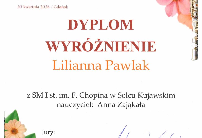 Pięć naszych uczennic wspaniale zaprezentowało się podczas IX Kujawsko-Pomorskiego Konkursu Fletowego: Anastazja Błażkiewicz, Vanessa Wieczór, Lilianna Pawlak, Laura Hołoga i Wiktoria Piekarska. Anastazja Błażkiewicz, Vanessa Wieczór i Laura Hołoga zdobyły wyróżnienie. Lilianna Pawlak została laureatką III miejsca ex aequo oraz otrzymała nagrodę dla wyróżniającego się uczestnika z Solca Kujawskiego, ufundowaną […]