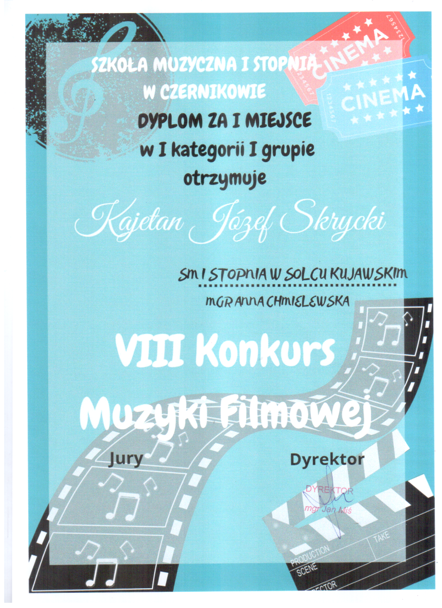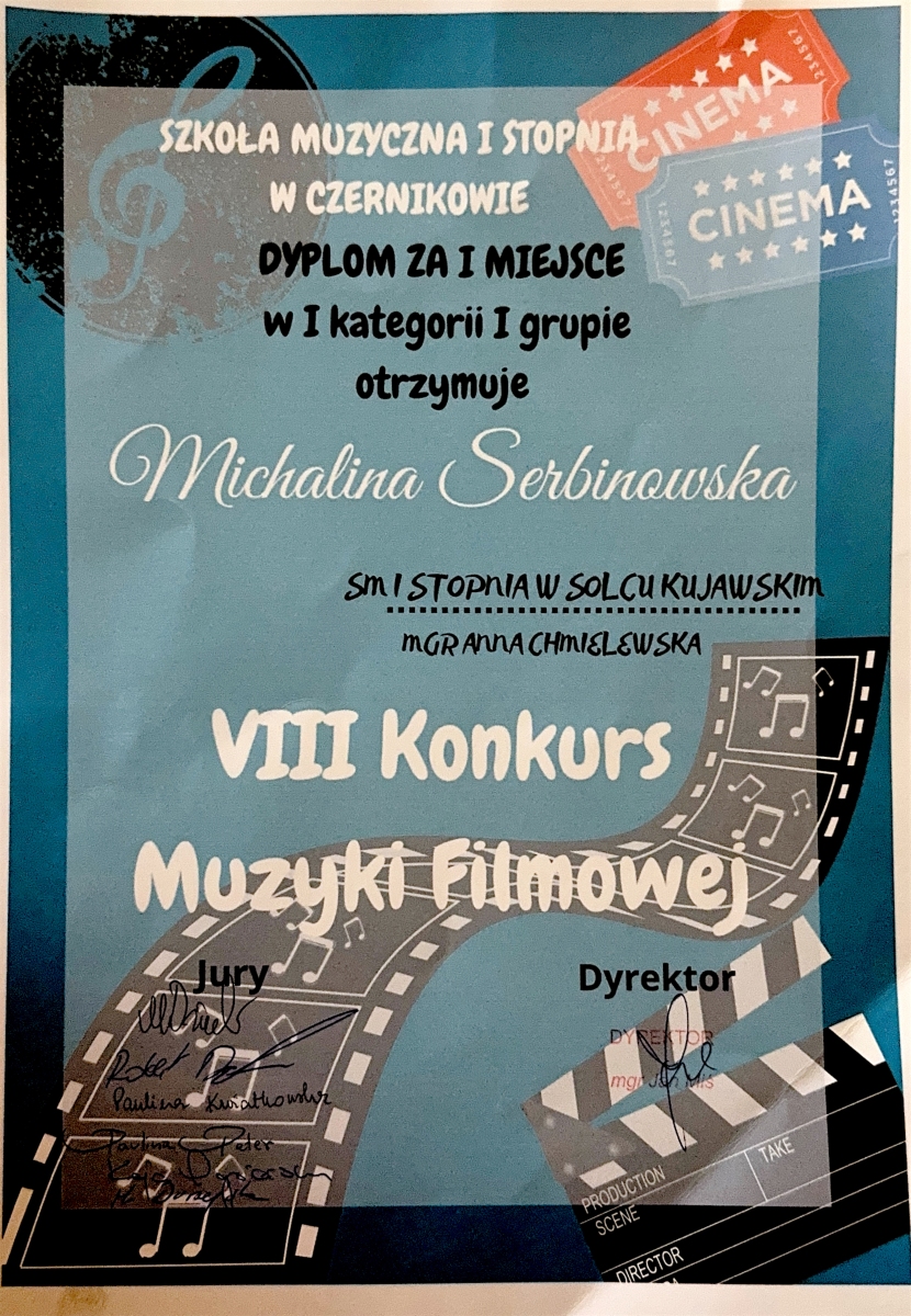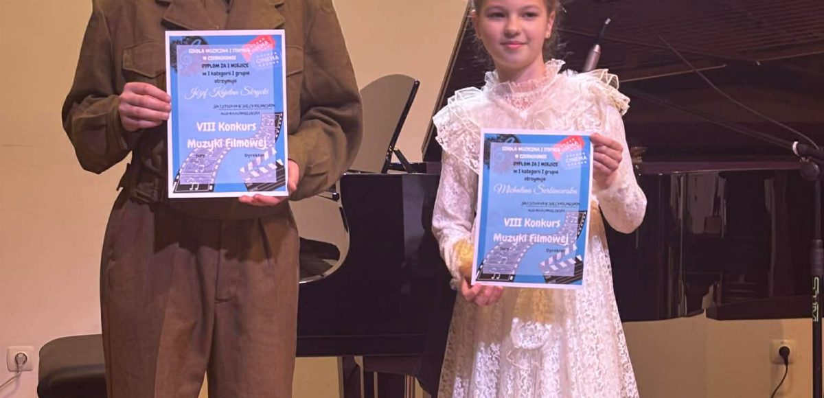 Michalina Serbinowska i Kajetan Skrycki – uczniowie klasy organów mgr Anny Chmielewskiej – zajęli Ex aequo 1 miejsce w międzyszkolnym konkursie muzyki filmowej w Czernikowie.