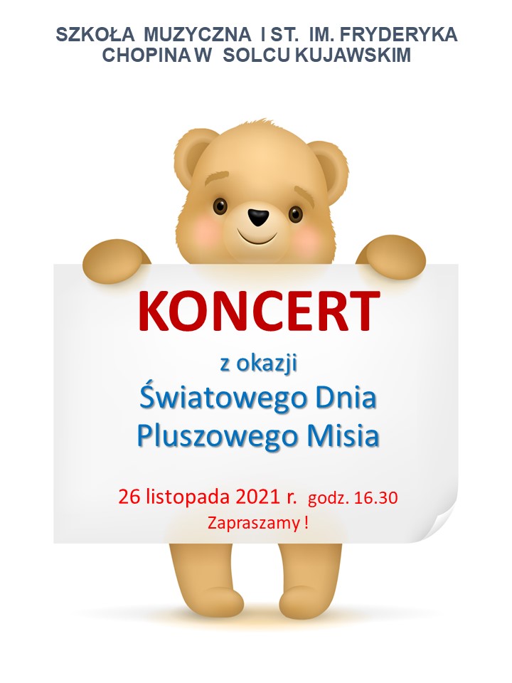 23 listopada, 2021 Koncert z okazji Światowego Dnia Pluszowego Misia, 26.11.2021 r. Plakat informujący o Koncercie z okazji Światowego Dnia Pluszowego Misia, 26.11.2021 r. o godz. 16.30.