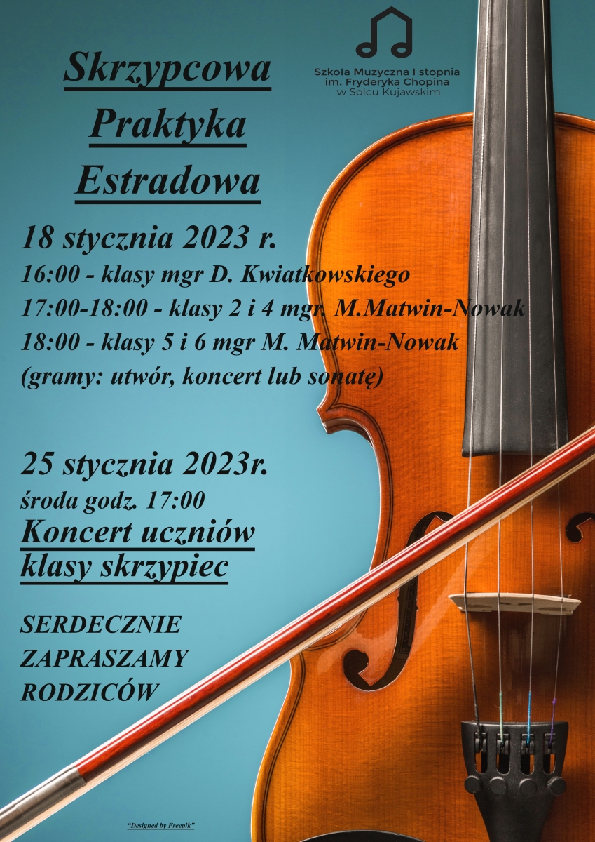 11 stycznia, 2023 Skrzypcowa Praktyka Estradowa – 18.01.2023 r. oraz Koncert uczniów klasy skrzypiec – 25.01.2023 r. – zaproszenie
