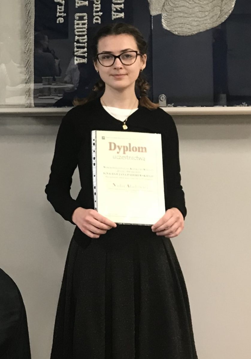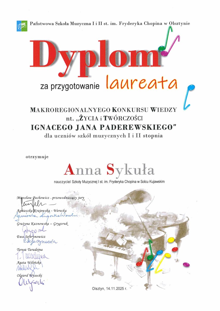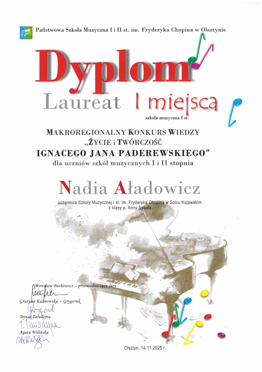 14 listopada 2025 r. w Państwowej Szkole Muzycznej I i II stopnia w Olsztynie odbył się Makroregionalny Konkurs Wiedzy nt. Życia i twórczości Ignacego Jana Paderewskiego, podczas którego uczennica klasy IV c.4 Nadia Aładowicz zajęła I miejsce w kategorii szkół muzycznych I stopnia. Nadię do konkursu przygotowała mgr Anna Sykuła.